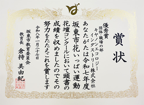 2026年1月27日「令和7年度 坂東市花いっぱいコンクール」にて「優秀賞」を受賞しました。このコンクールは坂東市が花と緑にあふれた快適なまちづくりの推進を目的として開催し、花づくり、花壇づくりを通して美しい景観、良好な環境づくりを進めている学校や団体に贈られるものです。