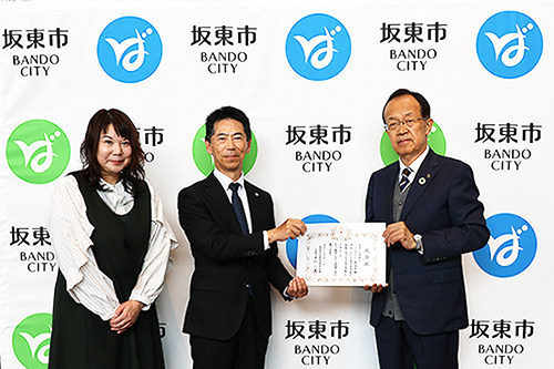 坂東市役所で行われた伝達式には社長の海原が出席し、木村坂東市長から感謝状をいただきました。
