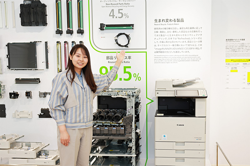 製造部門に所属し、主に複合機のリユースを担当しています。お客様が使わなくなった複合機を分解し、清掃、組み立てを行い、再生複合機としてよみがえらせる仕事です。今では、約8割の工程を1人でこなせるようになったので、1台丸ごと仕上げることを目標にしています。さらに、作業の効率化や品質向上のための現場改善にも積極的に取り組んでいます。